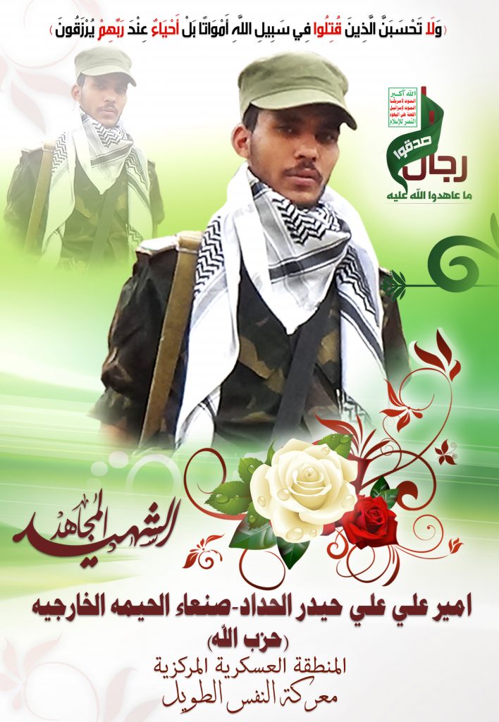 Actor أمير علي علي حيدر سالم الحداد Filmography الشهيد المجاهد: أمير علي علي حيدر سالم الحداد – حزب الله المحافظة: صنعاء المديرية: الحيمة الخارجية – بني شمهان معركة النفس الطويل رقم الحافظة: 137248
