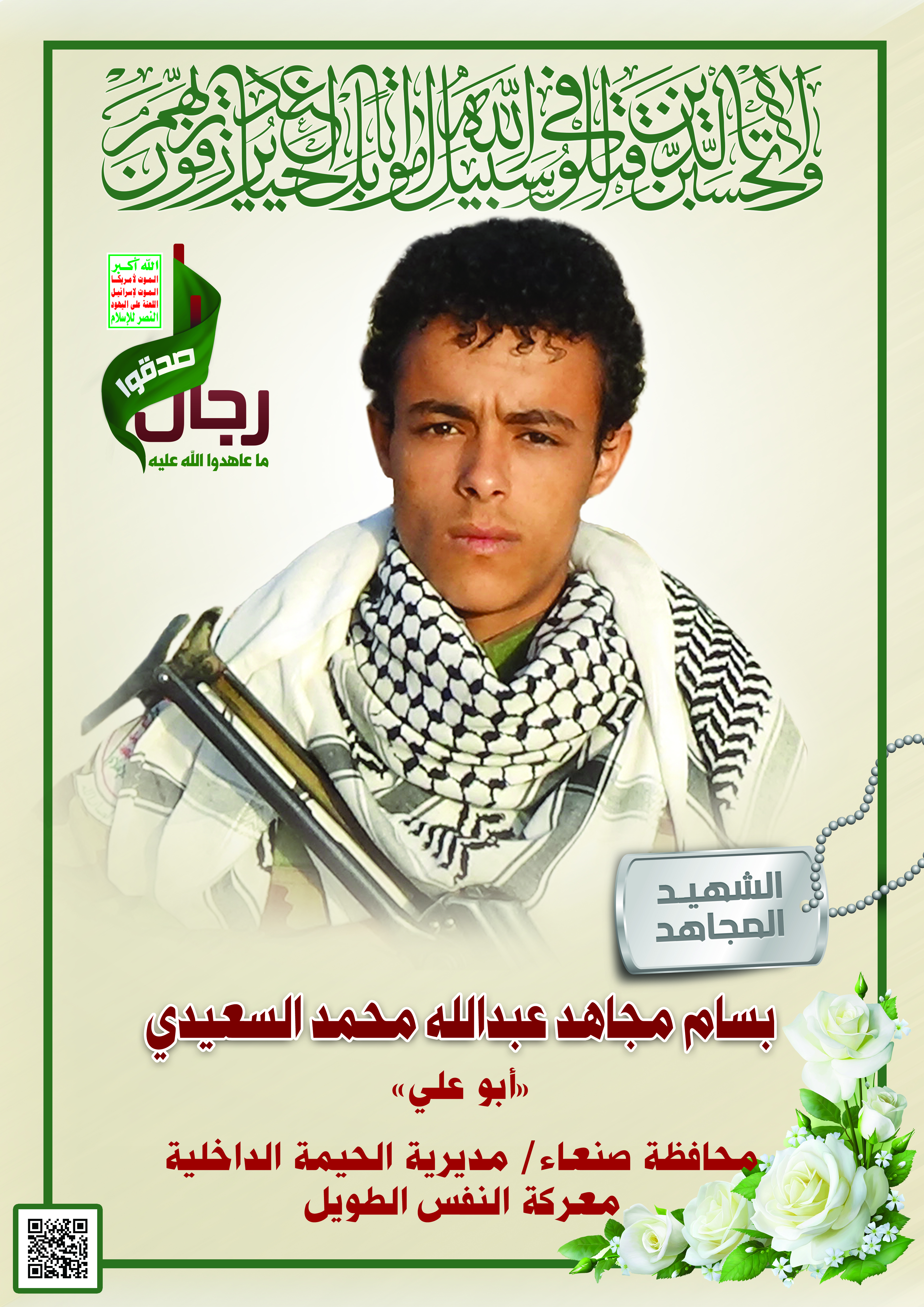 Actor بسام مجاهد عبدالله محمد علي السعيدي Filmography الشهيد المجاهد: بسام مجاهد عبدالله محمد علي السعيدي – أبو علي المحافظة: صنعاء المديرية: الحيمة الداخلية – الحدب معركة النفس الطويل رقم الحافظة: 137445
