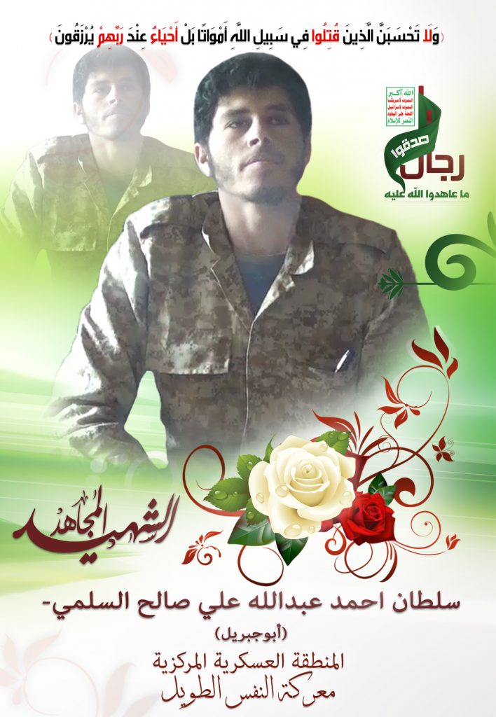 Actor سلطان أحمد عبدالله علي صالح العبدلي السلمي Filmography الشهيد المجاهد: سلطان أحمد عبدالله علي صالح العبدلي السلمي – أبو جبريل المحافظة: صنعاء المديرية: الحيمة الداخلية – معركة النفس الطويل رقم الحافظة: 137693