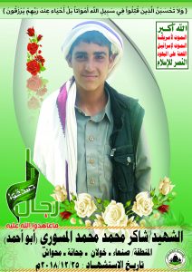Actor شاكر محمد محمد محمد حسين المسوري Filmography الشهيد المجاهد: شاكر محمد محمد محمد حسين المسوري – أبو أحمد المحافظة: صنعاء المديرية: جحانة – محواش معركة النفس الطويل رقم الحافظة: 137720