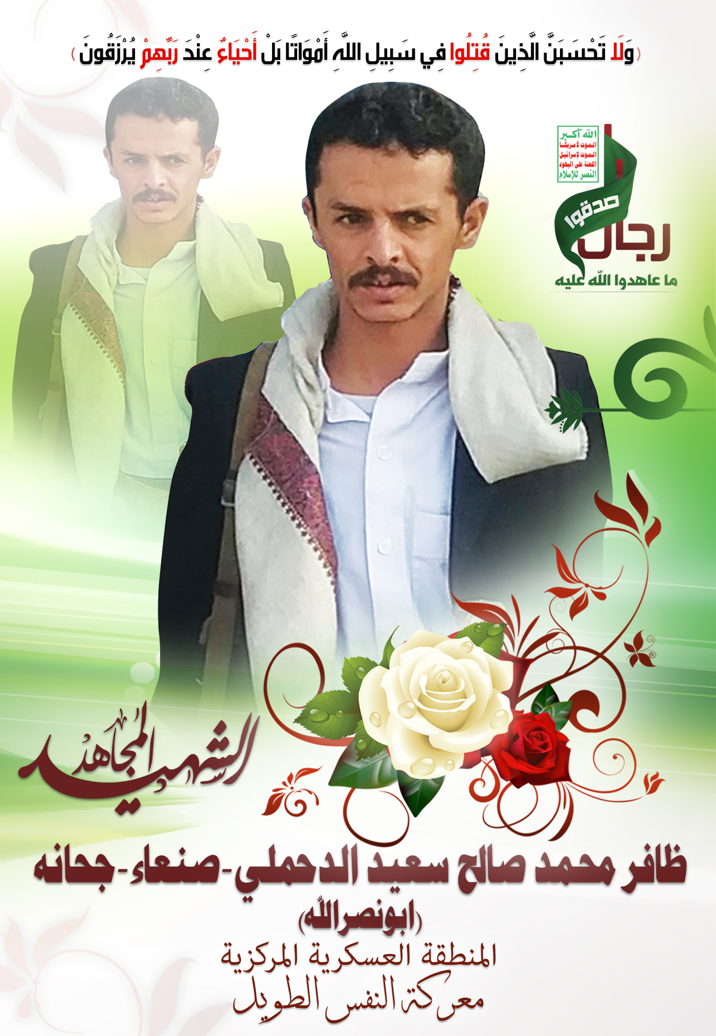 Actor ظافر محمد صالح سعيد الدحملي Filmography الشهيد المجاهد: ظافر محمد صالح سعيد الدحملي – أبو نصرالله المحافظة: صنعاء المديرية: جحانة – معركة النفس الطويل رقم الحافظة: 137829