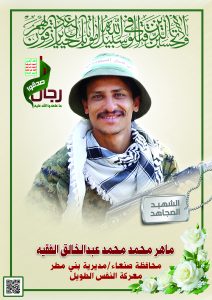 Actor ماهر محمد محمد عبدالخالق محمد الفقيه Filmography الشهيد المجاهد: ماهر محمد محمد عبدالخالق محمد الفقيه – المحافظة: صنعاء المديرية: بني مطر – حضران معركة النفس الطويل رقم الحافظة: 138184 FILMOGRAPHY icon لكم الخلود – الشهيد/ ماهر محمد محمد الفقيه (حزب الله) 30/11/2023