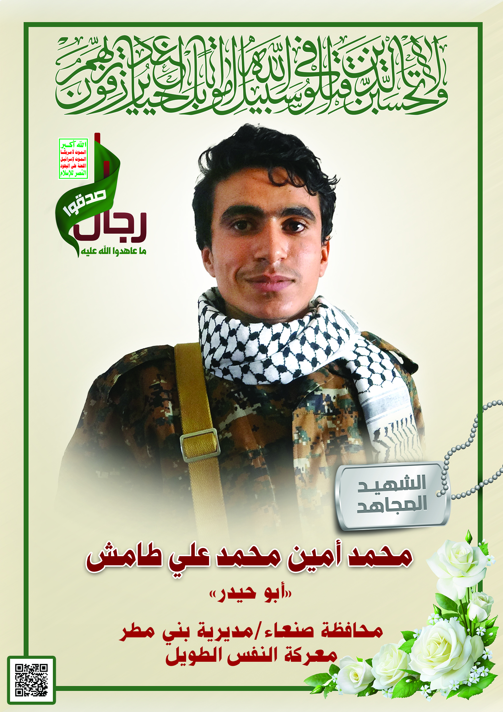 Actor محمد أمين محمد علي عبدالله طامش Filmography الشهيد المجاهد: محمد أمين محمد علي عبدالله طامش – أبو حيدر المحافظة: صنعاء المديرية: بني مطر – معركة النفس الطويل رقم الحافظة: 138218 FILMOGRAPHY icon لكم الخلود – الشهيد محمد أمين طامش (أبو حيدر) 25/11/2024 25/11/2024