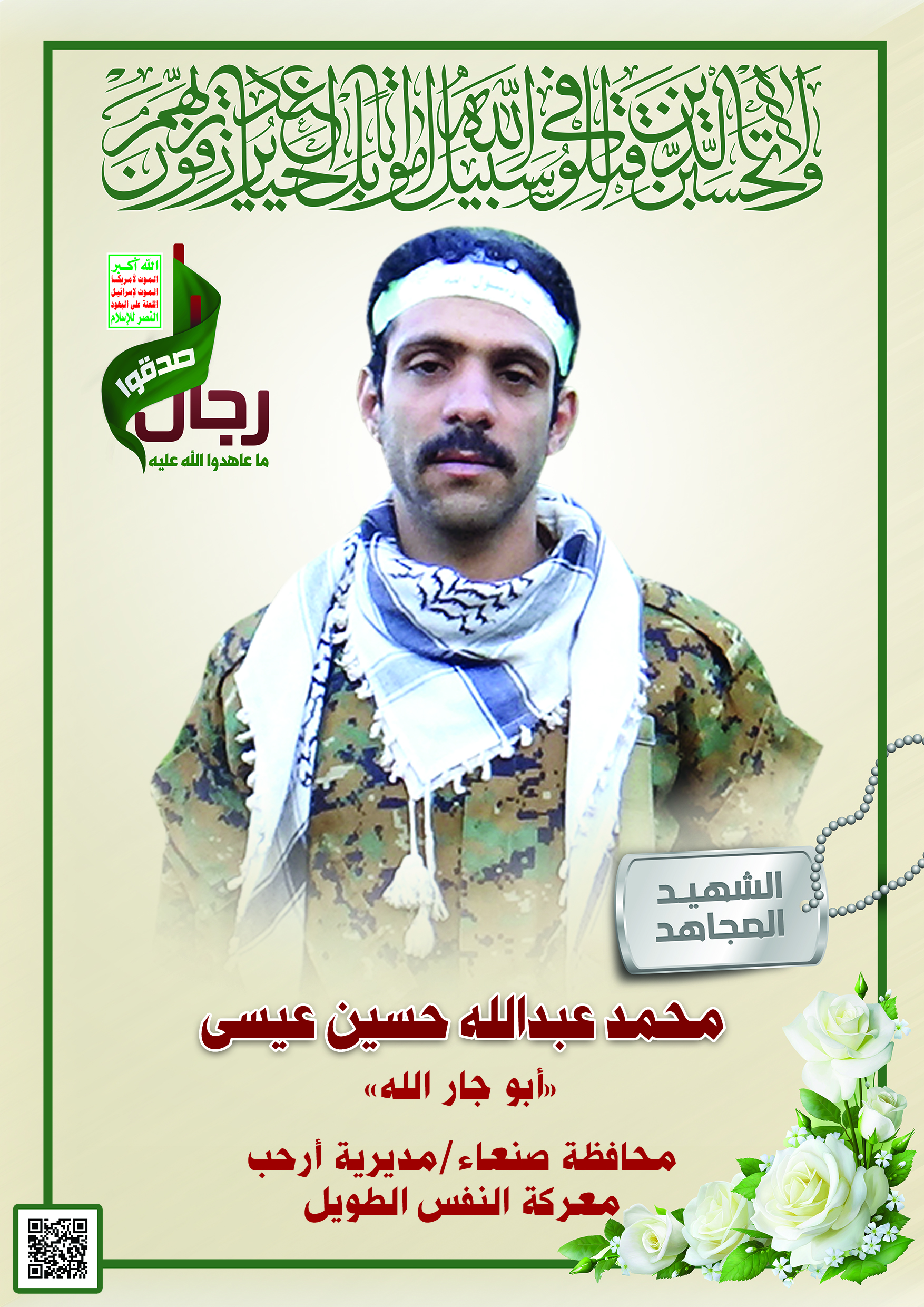 Actor محمد عبدالله حسين سعد قائد عيسى Filmography الشهيد المجاهد: محمد عبدالله حسين سعد قائد عيسى – أبو جارالله المحافظة: صنعاء المديرية: أرحب – معركة النفس الطويل رقم الحافظة: 138255