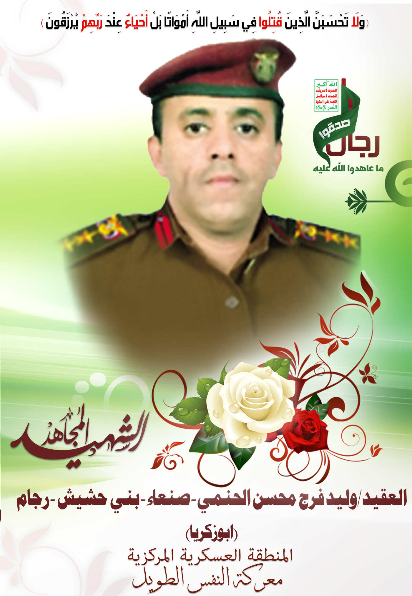 Actor وليد فرج محسن أحمد حسين الحنمي Filmography الشهيد المجاهد: وليد فرج محسن أحمد حسين الحنمي – المحافظة: صنعاء المديرية: بني حشيش – رجام معركة النفس الطويل رقم الحافظة: 138454