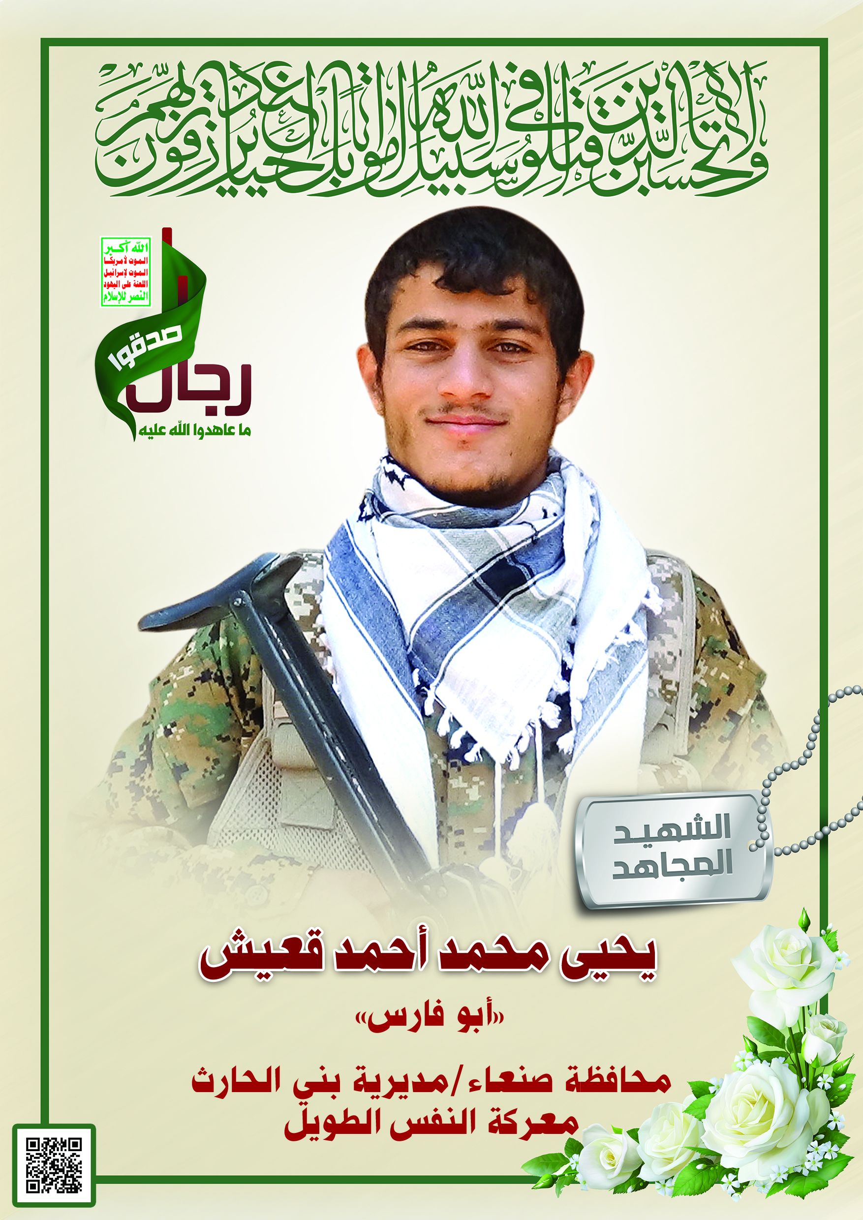 Actor يحيى محمد أحمد سعد قعيش Filmography الشهيد المجاهد: يحيى محمد أحمد سعد قعيش – أبو فارس المحافظة: صنعاء المديرية: بني الحارث – الروضة معركة النفس الطويل رقم الحافظة: 138481 FILMOGRAPHY icon وصايا الخالدين || الشهيد/ يحيى محمد أحمد سعد قعيش (أبو فارس) 25/11/2021 25/11/2021
