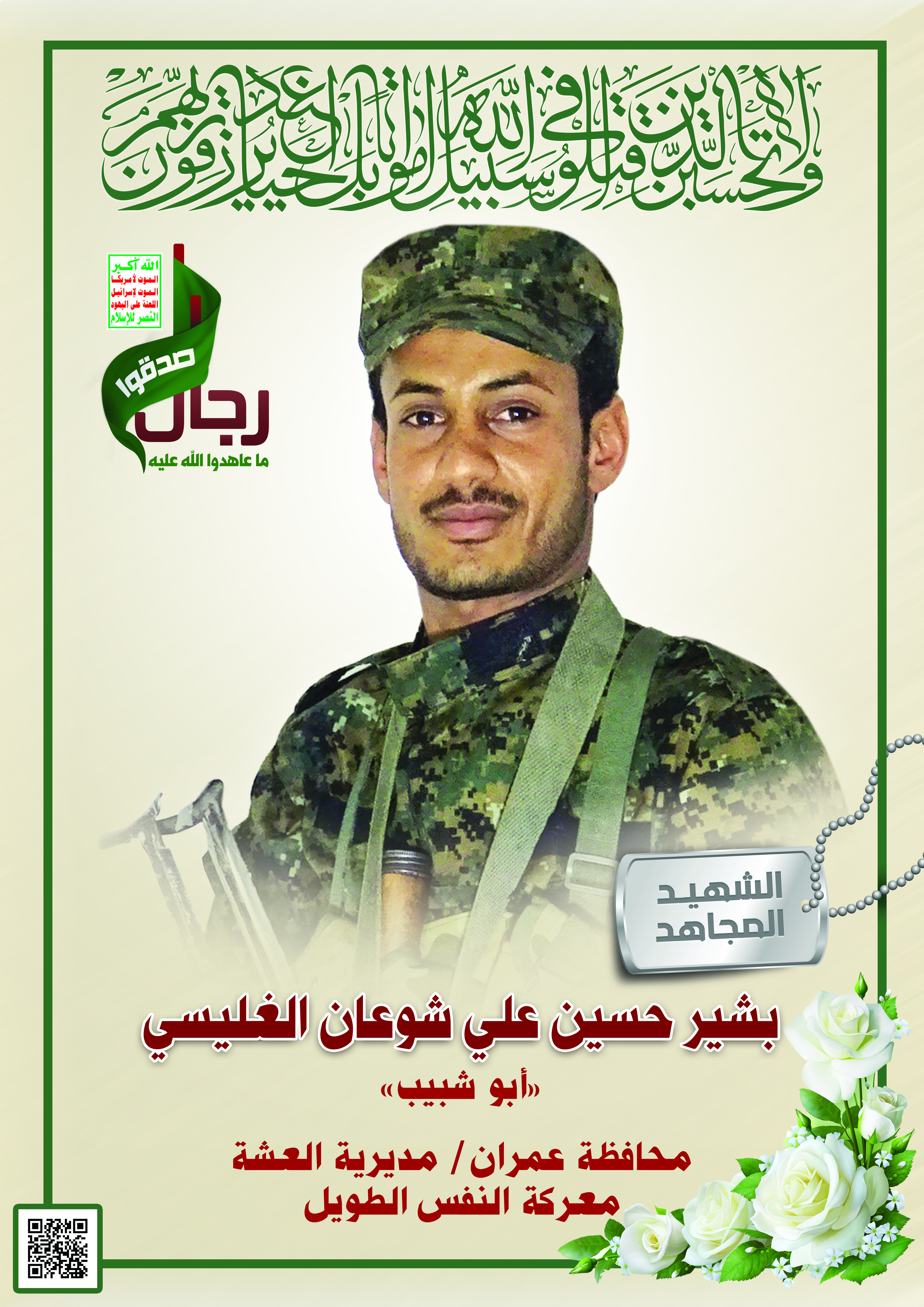 Actor بشير حسين علي شوعان علي الغليسي Filmography الشهيد المجاهد: بشير حسين علي شوعان علي الغليسي – أبو شبيب المحافظة: عمران المديرية: العشة – السواد معركة النفس الطويل رقم الحافظة: 138631 FILMOGRAPHY icon زامل خير الناس | أمين حمزة – 1444هـ 10/12/2022 07/01/2023