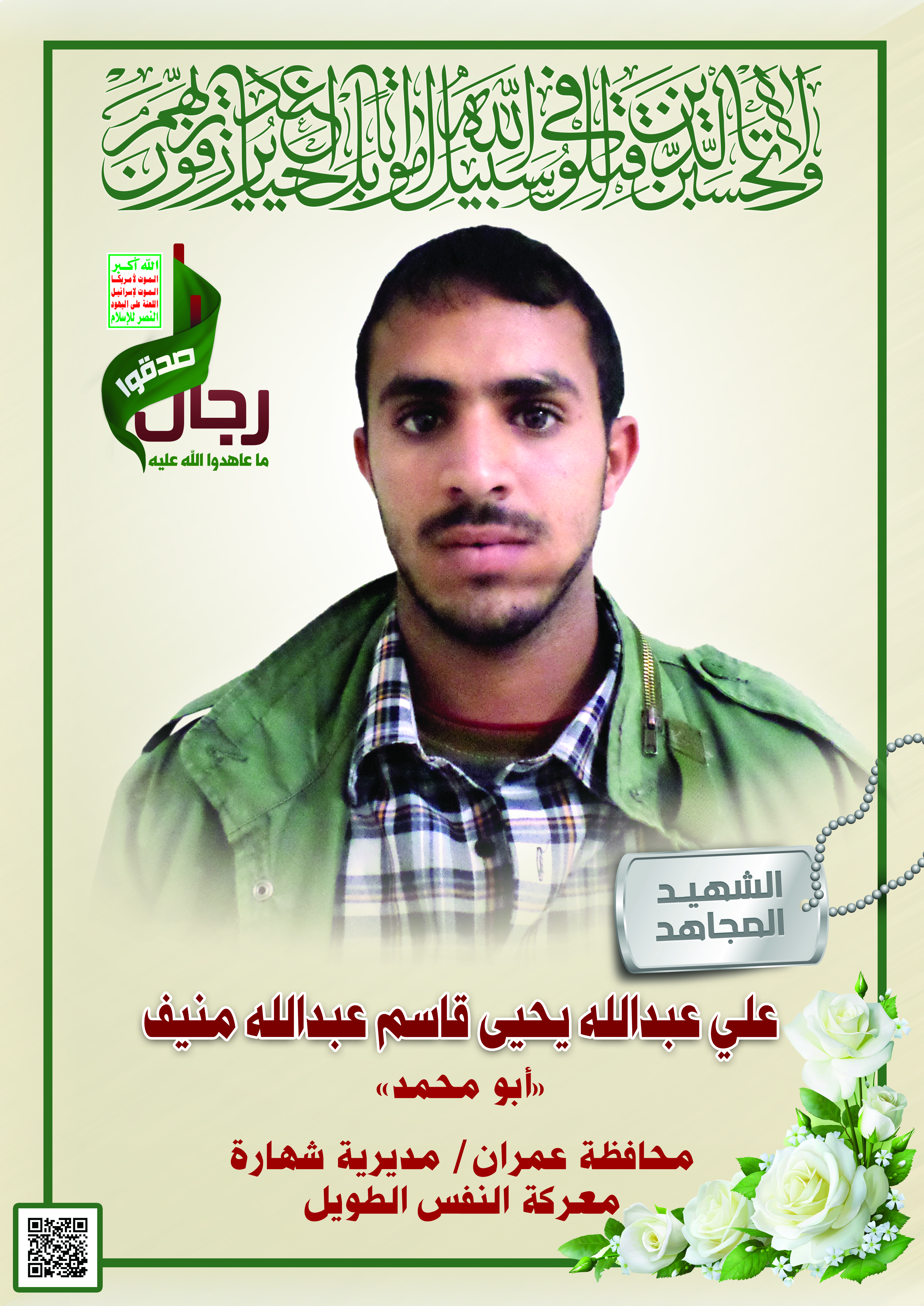 Actor علي عبدالله يحيى قاسم عبدالله منيف Filmography SAMSUNG CAMERA PICTURES الشهيد المجاهد: علي عبدالله يحيى قاسم عبدالله منيف – أبو محمد المحافظة: عمران المديرية: شهارة – النجد معركة النفس الطويل رقم الحافظة: 138949 FILMOGRAPHY icon فلاشة وصايا الخالدين – رضوان عبدالله عبدالله يحيى قاسم منيف “أبو حيدر” 08/02/2018 23/11/2021