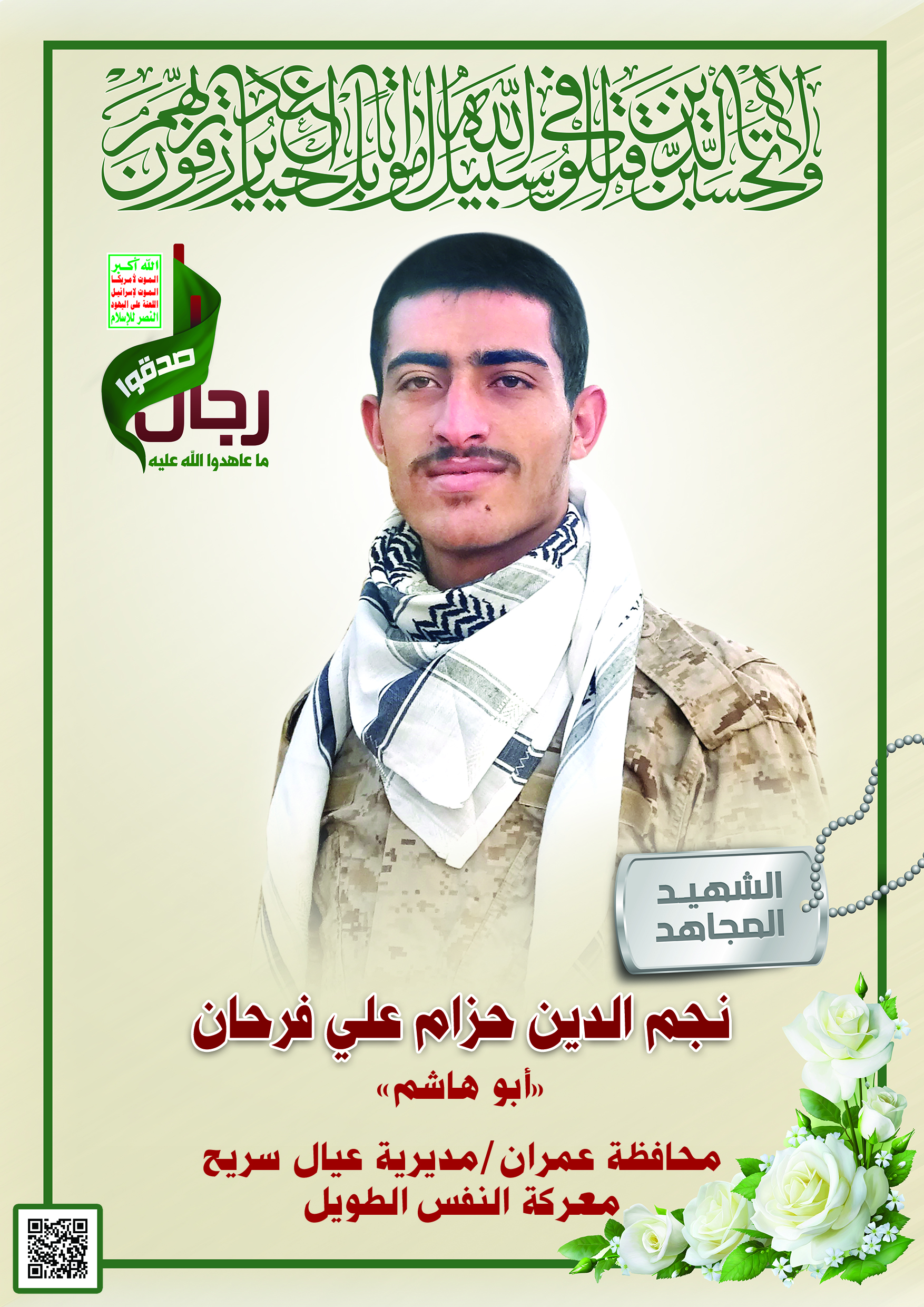 Actor نجم الدين حزام علي حزام فرحان Filmography الشهيد المجاهد: نجم الدين حزام علي حزام فرحان – أبو هاشم المحافظة: عمران المديرية: عيال سريح – معركة النفس الطويل رقم الحافظة: 139107 FILMOGRAPHY icon وصايا الخالدين || الشهيد/ نجم الدين حزام علي حزام فرحان (أبو هاشم) 01/12/2021