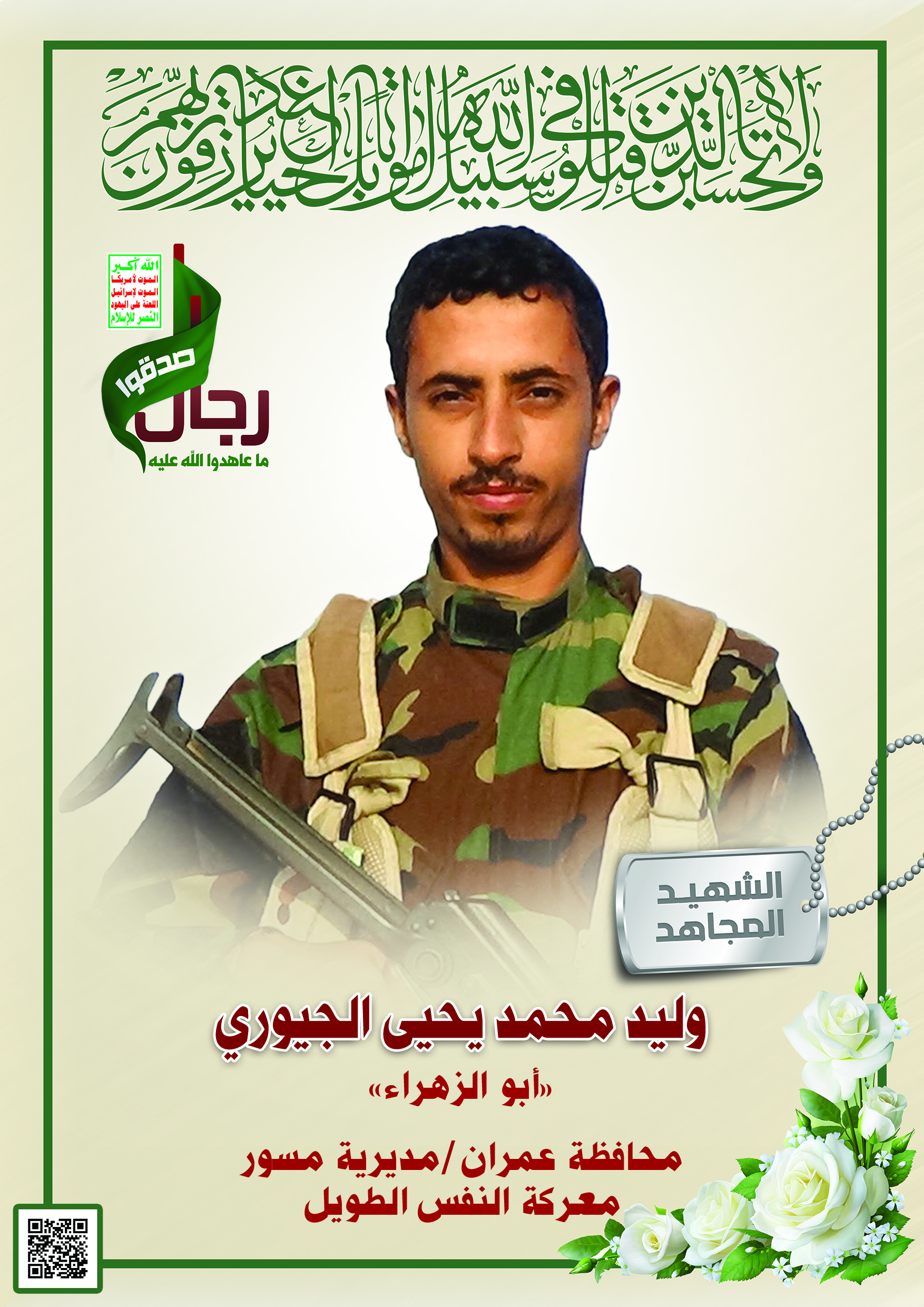 Actor وليد محمد يحيى عبدالله عبدالله الجيوري Filmography الشهيد المجاهد: وليد محمد يحيى عبدالله عبدالله الجيوري – أبو الزهراء المحافظة: عمران المديرية: مسور – الوادي معركة النفس الطويل رقم الحافظة: 139144