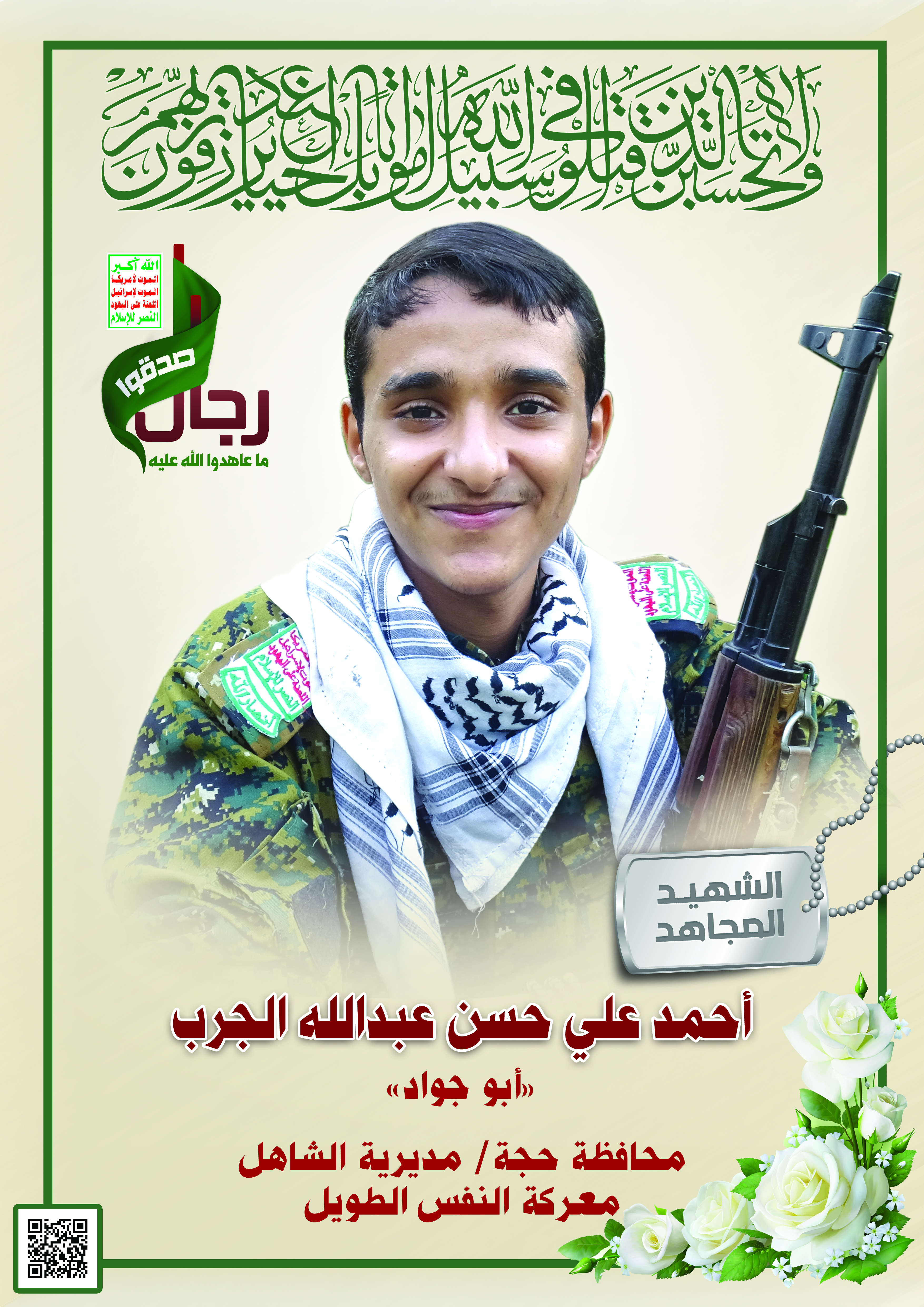 Actor أحمد علي حسن عبدالله حسن الجرب Filmography الشهيد المجاهد: أحمد علي حسن عبدالله حسن الجرب المحافظة: حجة المديرية: الشاهل – جانب الشام المعلم معركة النفس الطويل رقم الحافظة: 139250 FILMOGRAPHY icon نفحة من عطاءاتهم – القول السديد – 1442هـ 27/12/2020 15/12/2022