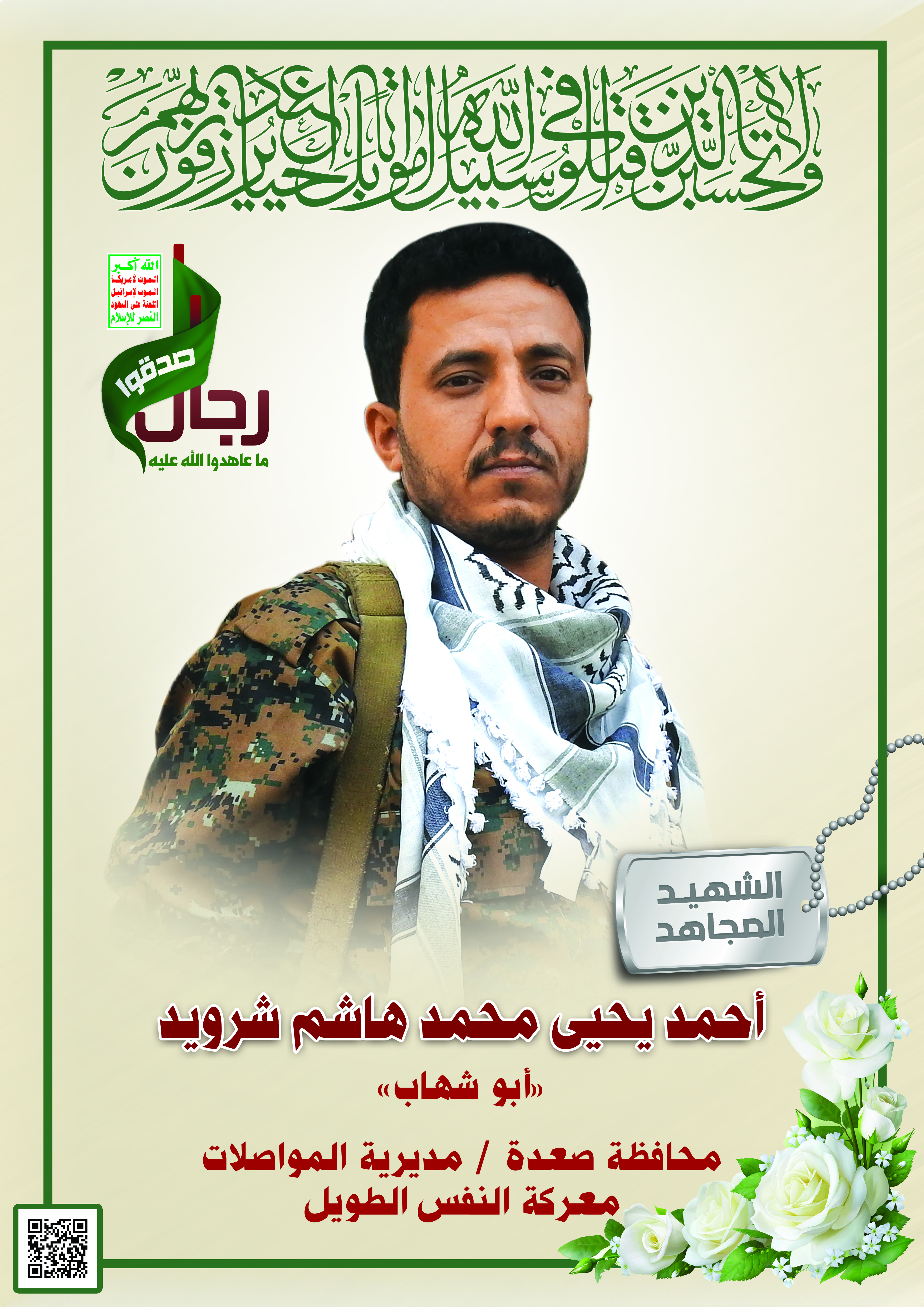 Actor أحمد يحيى محمد هاشم علي شرويد Filmography الشهيد المجاهد: أحمد يحيى محمد هاشم علي شرويد المحافظة: صعدة المديرية: ساقين – ساقين ساقين معركة النفس الطويل رقم الحافظة: 139268