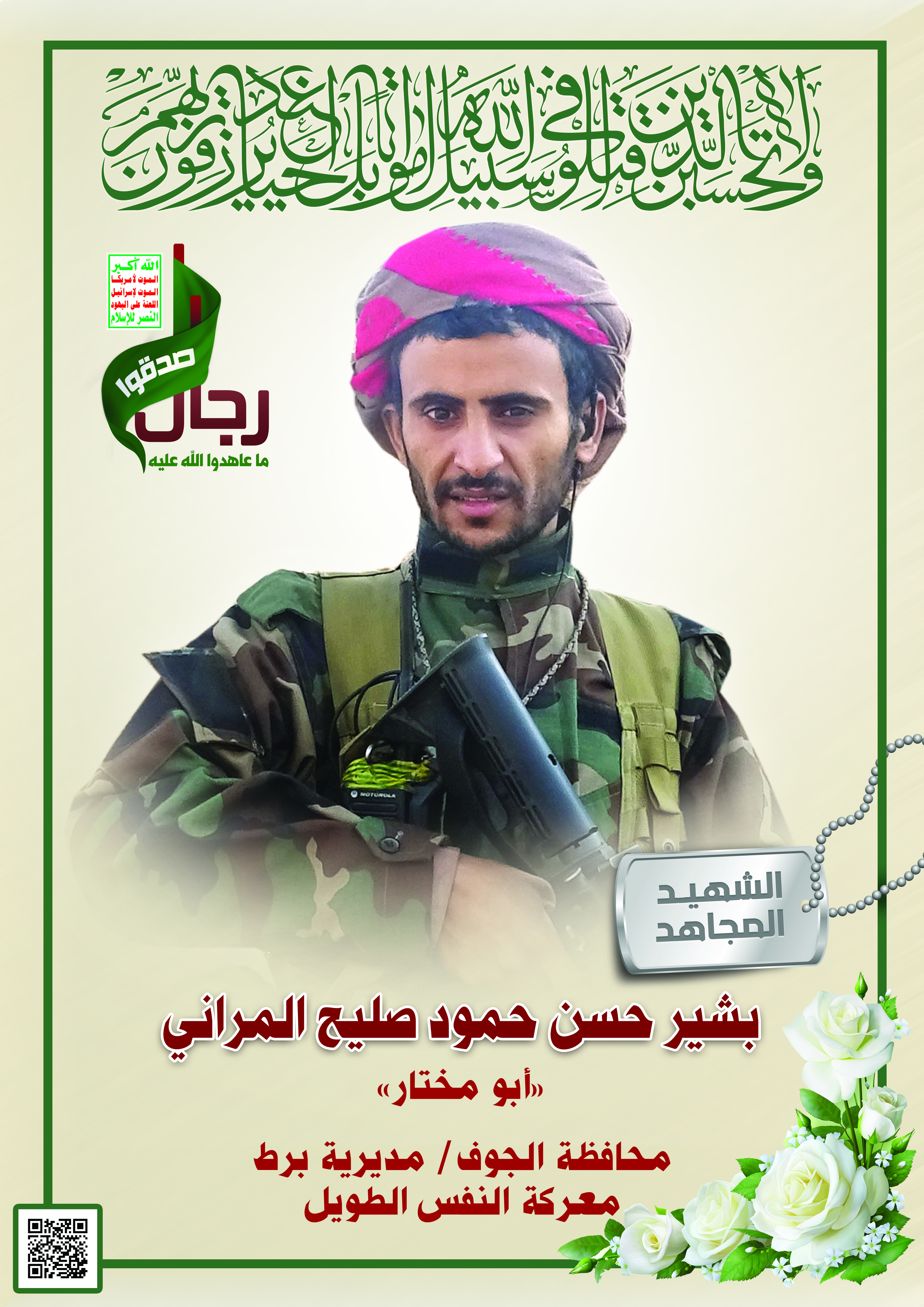 Actor بشير حسن حمود محمد صليح المراني Filmography الشهيد المجاهد: بشير حسن حمود محمد صليح المراني المحافظة: الجوف المديرية: برط العنان – معركة النفس الطويل رقم الحافظة: 139319