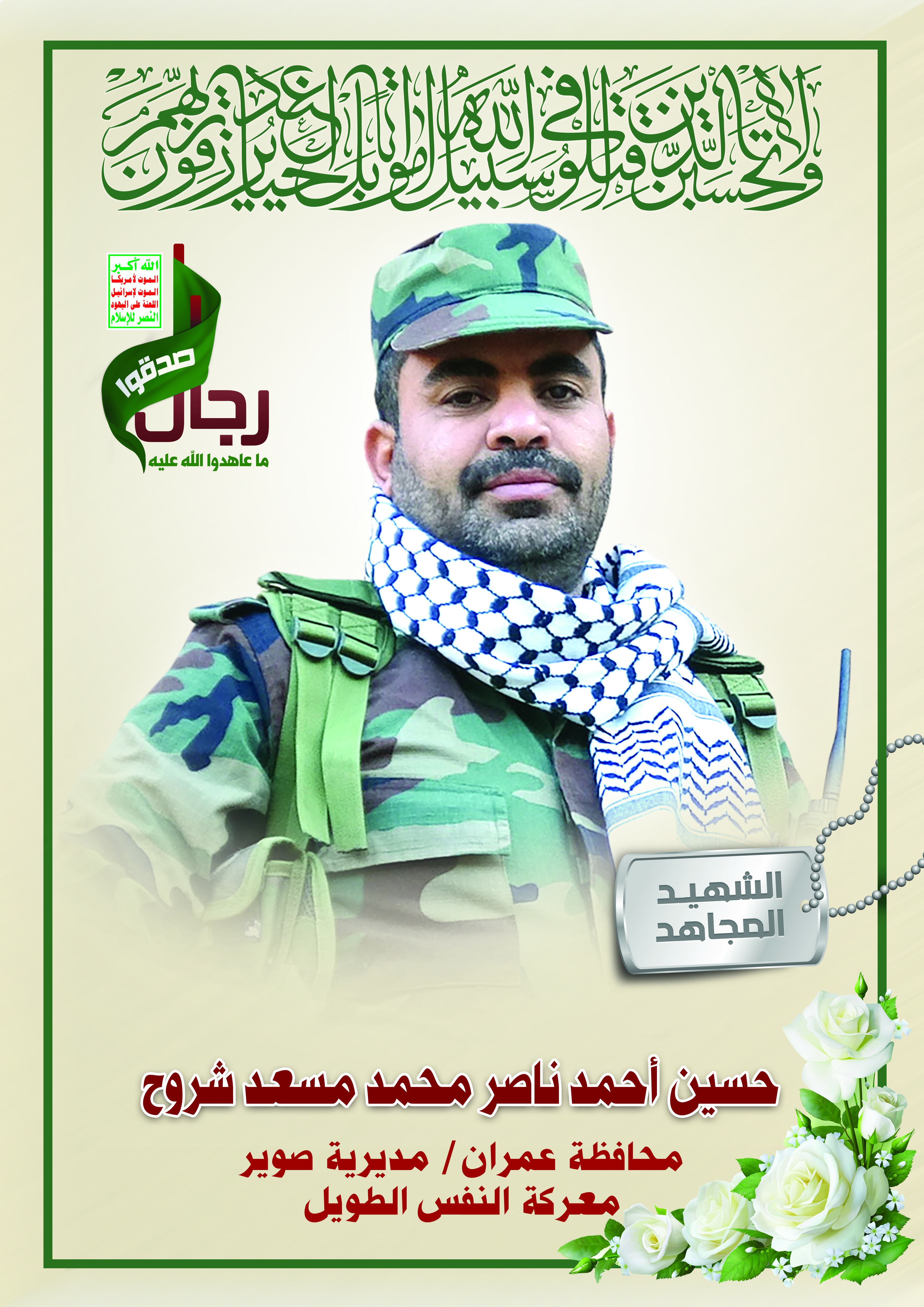 Actor حسين أحمد ناصر محمد مسعد شروح Filmography الشهيد المجاهد: حسين أحمد ناصر محمد مسعد شروح المحافظة: عمران المديرية: صوير – بكان فليح معركة النفس الطويل رقم الحافظة: 139367