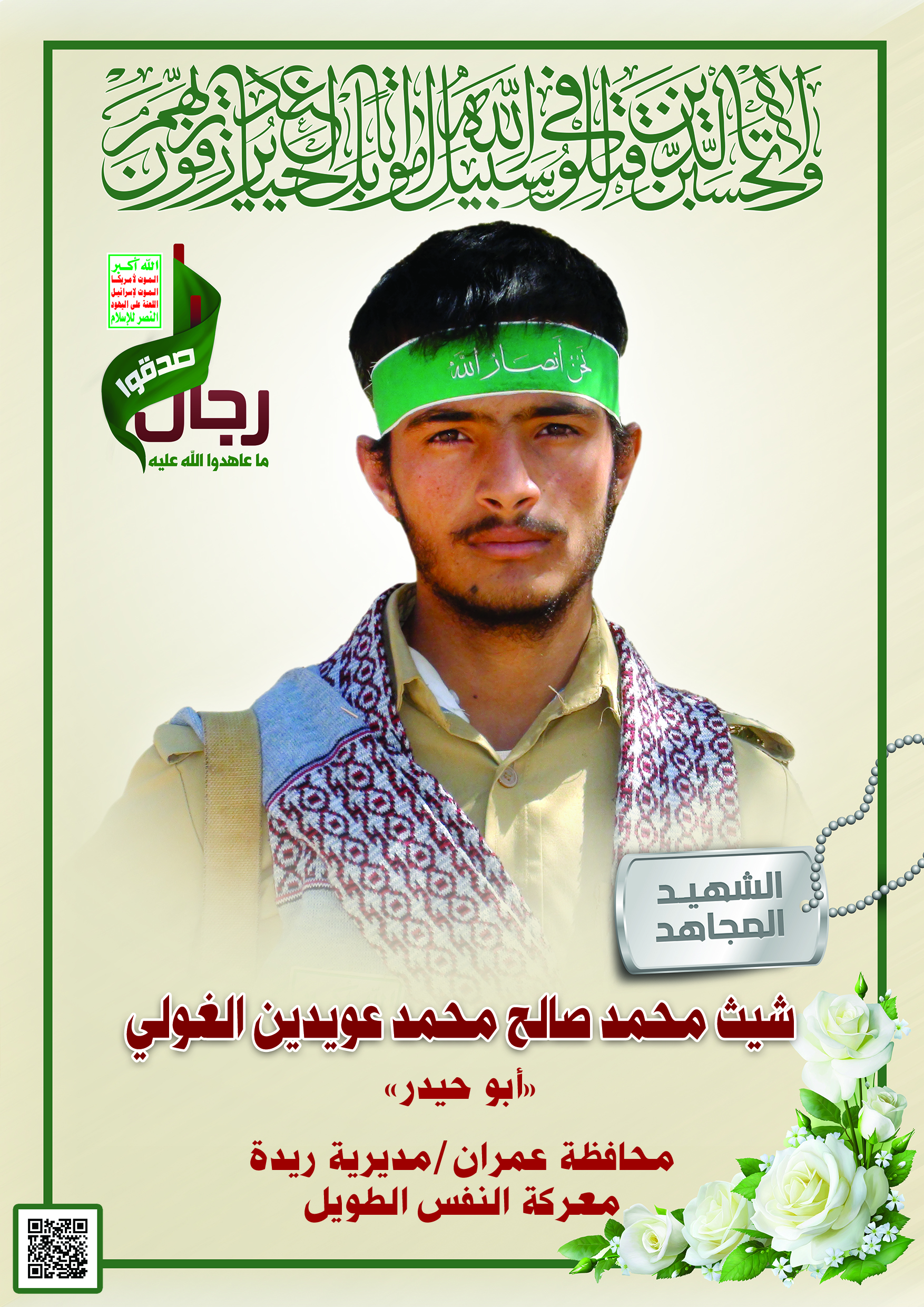 Actor شيث محمد صالح محمد عويدين الغولي Filmography الشهيد المجاهد: شيث محمد صالح محمد عويدين الغولي المحافظة: عمران المديرية: ريــده – غولــه عجيــب القصير معركة النفس الطويل رقم الحافظة: 139449 FILMOGRAPHY icon لكم الخلود – الشهيد شيث محمد صالح الغولي (أبو حيدر) 24/11/2024 24/11/2024