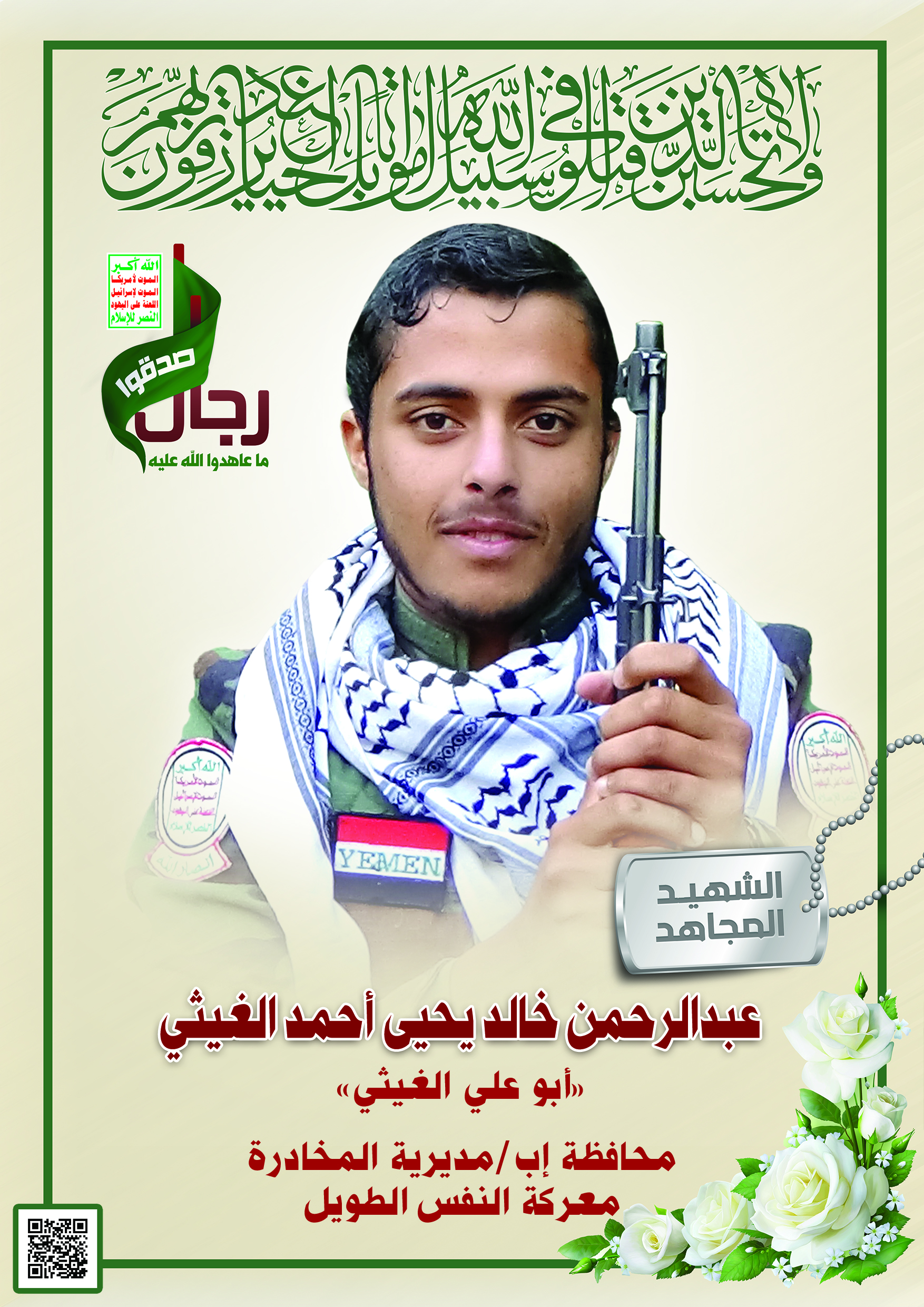 Actor عبدالرحمن خالد يحيى أحمد عبدالله الغيثي Filmography الشهيد المجاهد: عبدالرحمن خالد يحيى أحمد عبدالله الغيثي المحافظة: إب المديرية: المخادر – المخادر المخادر معركة النفس الطويل رقم الحافظة: 139531