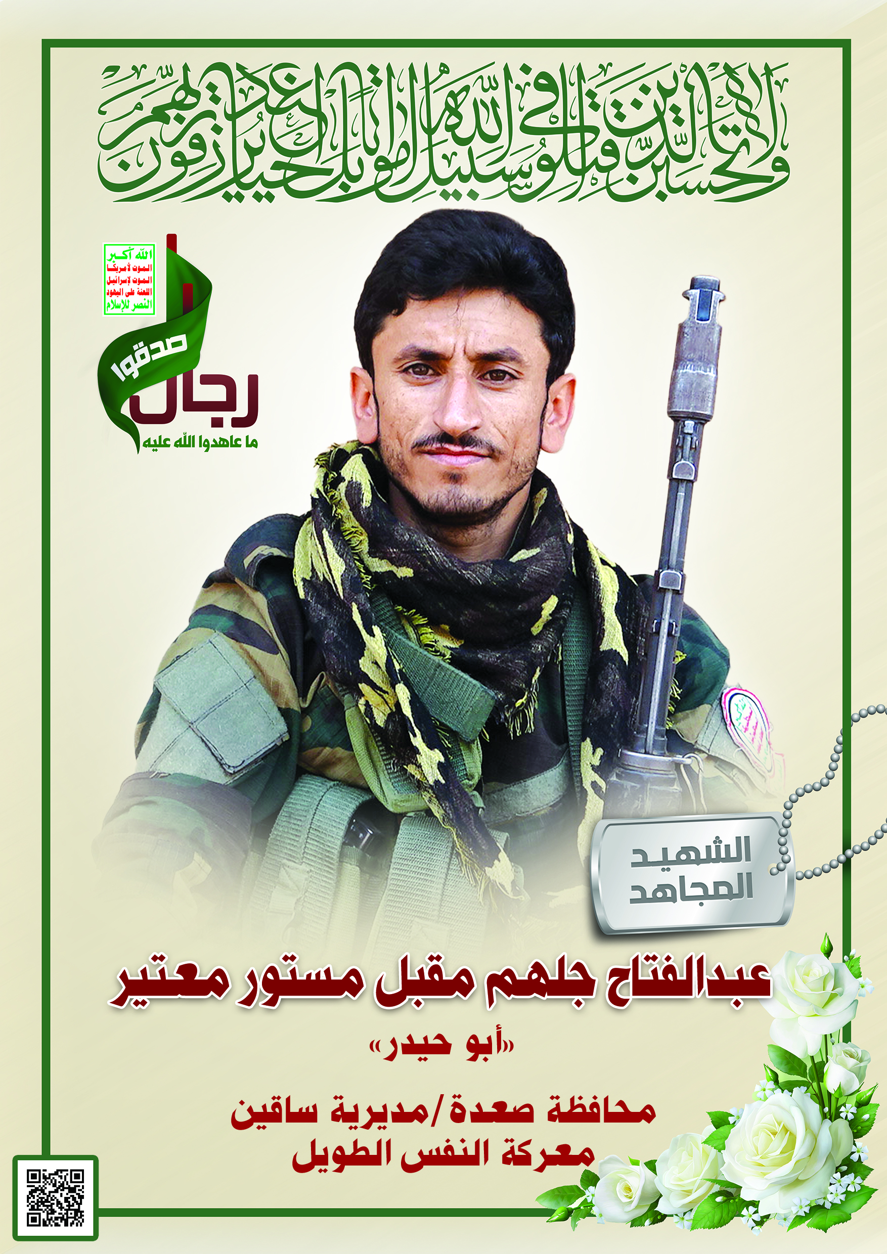 Actor عبدالفتاح جلهم مقبل مستور جلهم معتير Filmography الشهيد المجاهد: عبدالفتاح جلهم مقبل مستور جلهم معتير المحافظة: صعدة المديرية: ساقين – الكرب معركة النفس الطويل رقم الحافظة: 139549