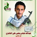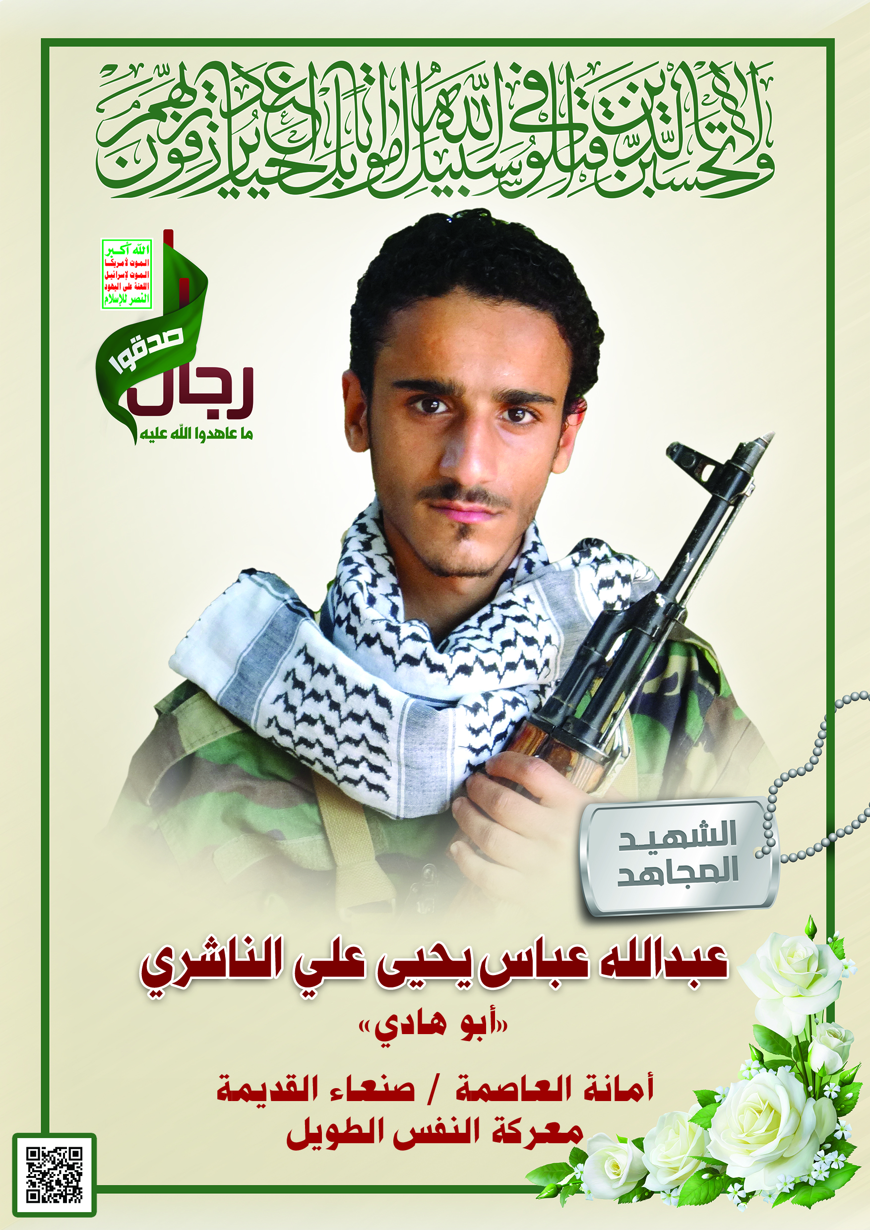 Actor عبدالله عباس يحيى علي محمد الناشري Filmography الشهيد المجاهد: عبدالله عباس يحيى علي محمد الناشري المحافظة: امانهالعاصمة المديرية: صنعاء القديمة – الخراز الخراز معركة النفس الطويل رقم الحافظة: 139572 FILMOGRAPHY icon لكم الخلود || الشهيد/ عبدالله عباس يحيى الناشري (أبو هادي) 04/03/2023 icon وصايا الخالدين || الشهيد/ عبدالله عباس يحيى الناشري (أبو هادي) 06/06/2022