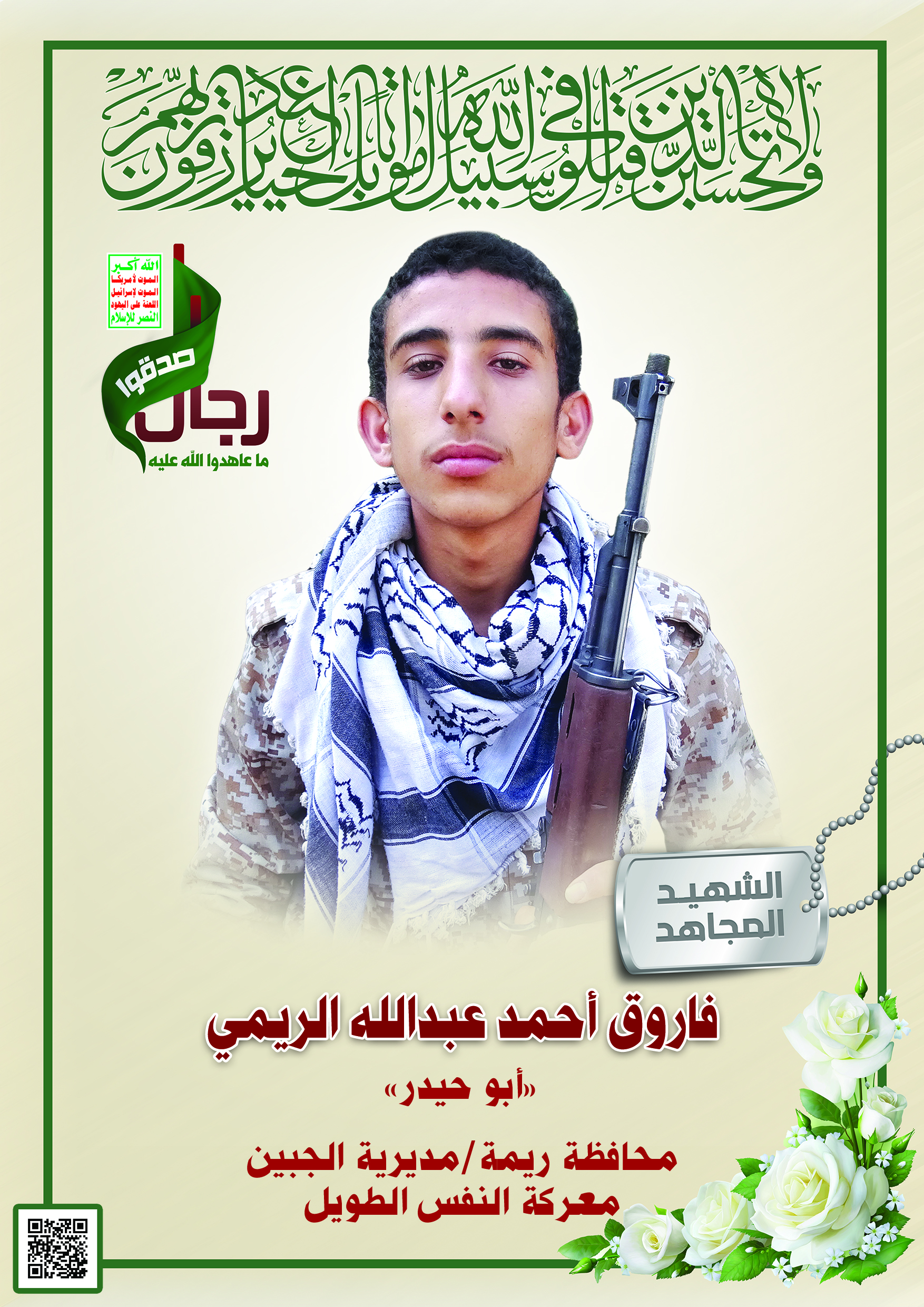 Actor فاروق أحمد عبدالله مهدي الريمي Filmography الشهيد المجاهد: فاروق أحمد عبدالله مهدي الريمي المحافظة: صنعاء المديرية: معين – شملان شملان معركة النفس الطويل رقم الحافظة: 139692