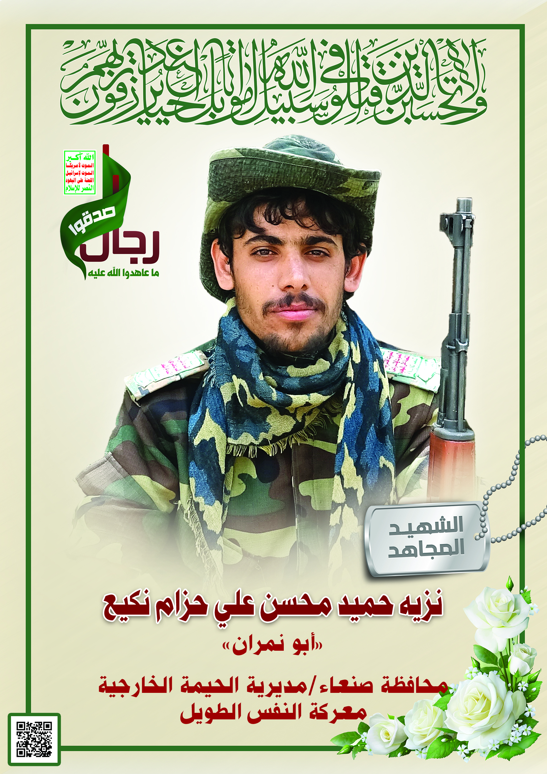 Actor نزيه حميد محسن علي حزام نكيع Filmography الشهيد المجاهد: نزيه حميد محسن علي حزام نكيع المحافظة: صنعاء المديرية: الحيمة الخارجية – بني بجير ذيبان معركة النفس الطويل رقم الحافظة: 139860 FILMOGRAPHY icon وصية الشهيد – نزيه حميد محسن نكيع (أبو نمران) 16/10/2024 16/10/2024