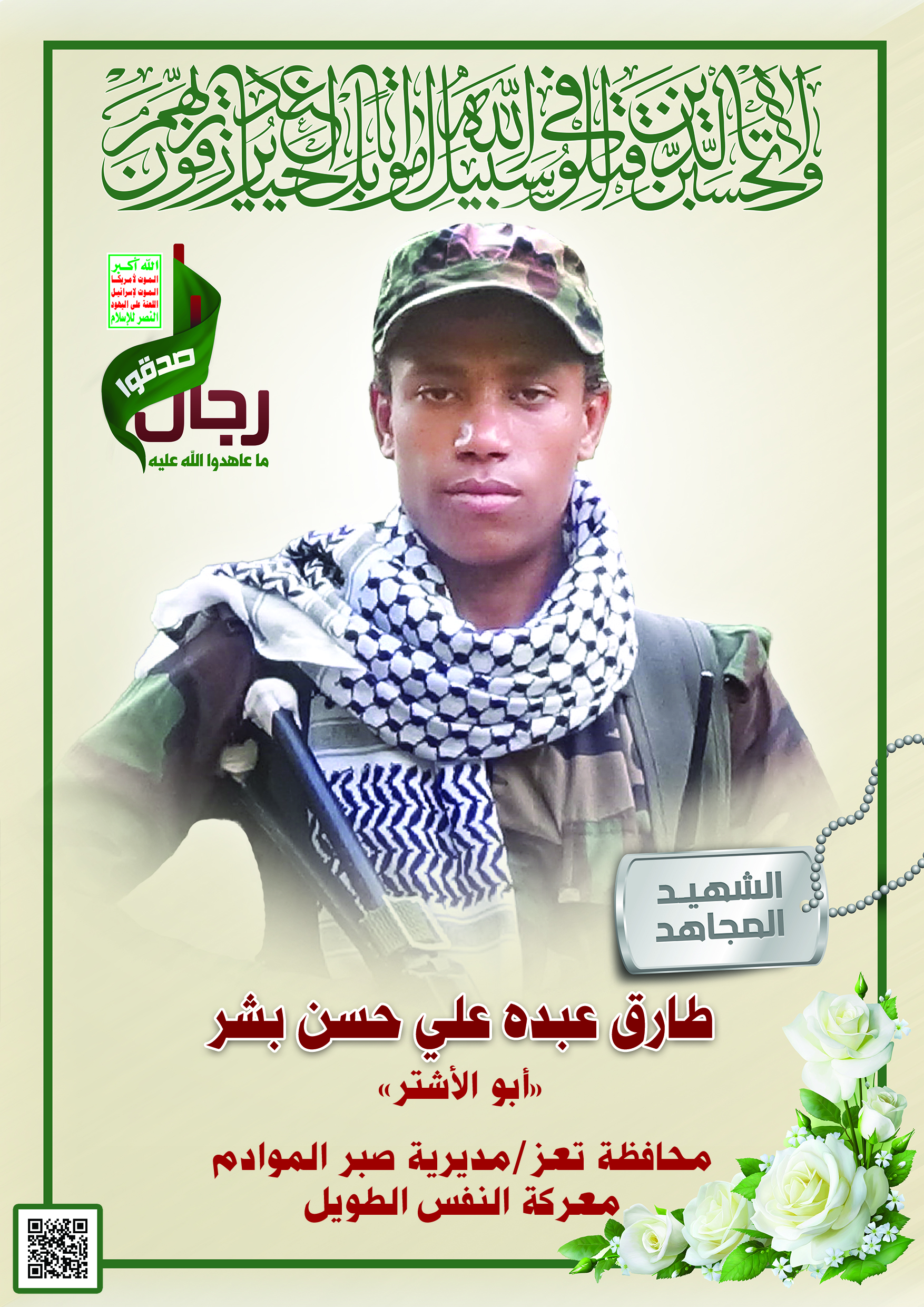 Actor طارق عبده علي حسن بشر Filmography الشهيد المجاهد: طارق عبده علي حسن بشر – أبو الاشتر المحافظة: تعز المديرية: صبر الموادم – معركة النفس الطويل رقم الحافظة: 140070