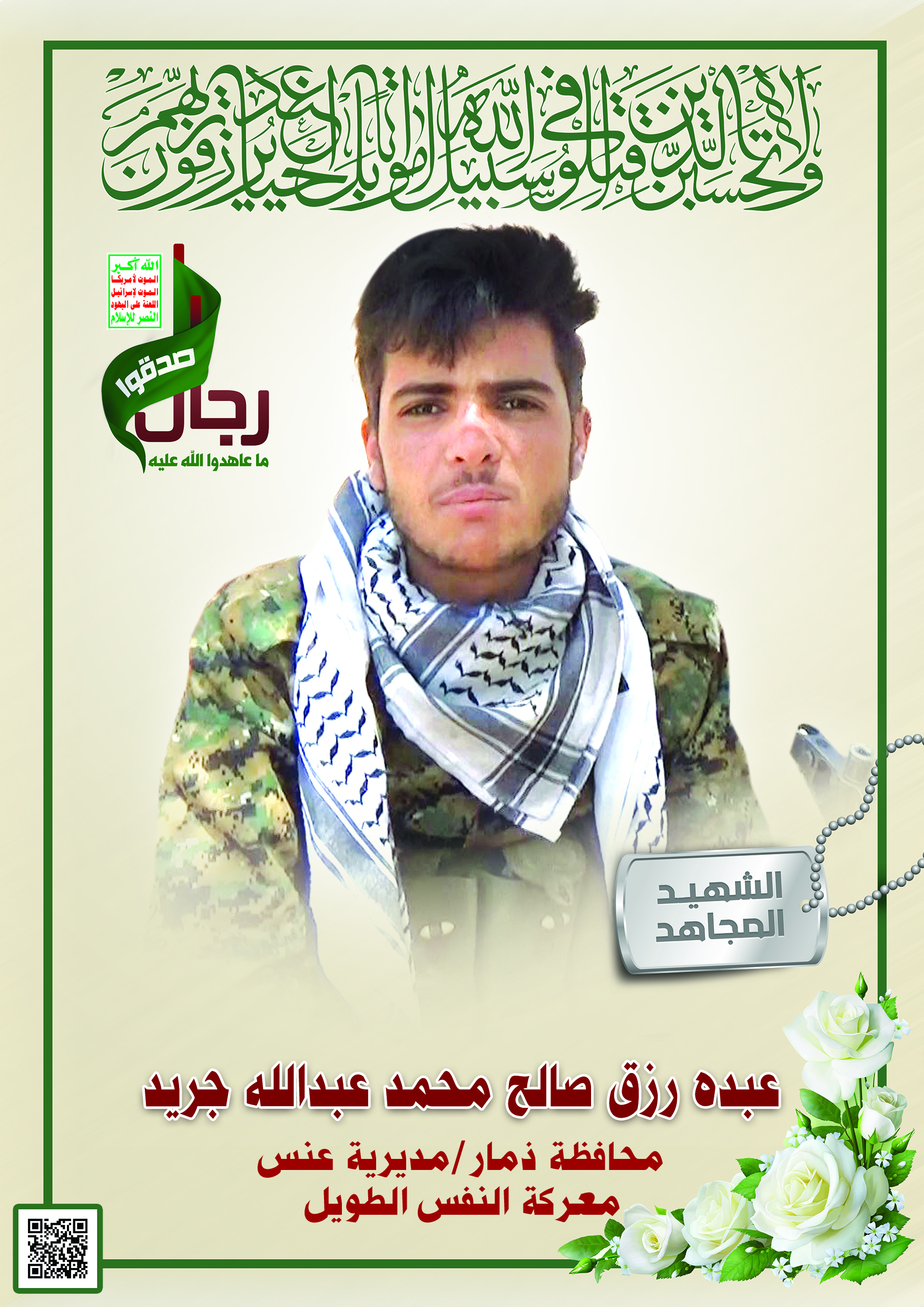 Actor عبده رزق صالح محمد عبدالله جريد Filmography الشهيد المجاهد: عبده رزق صالح محمد عبدالله جريد – المحافظة: ذمار المديرية: عنس – معركة النفس الطويل رقم الحافظة: 140164