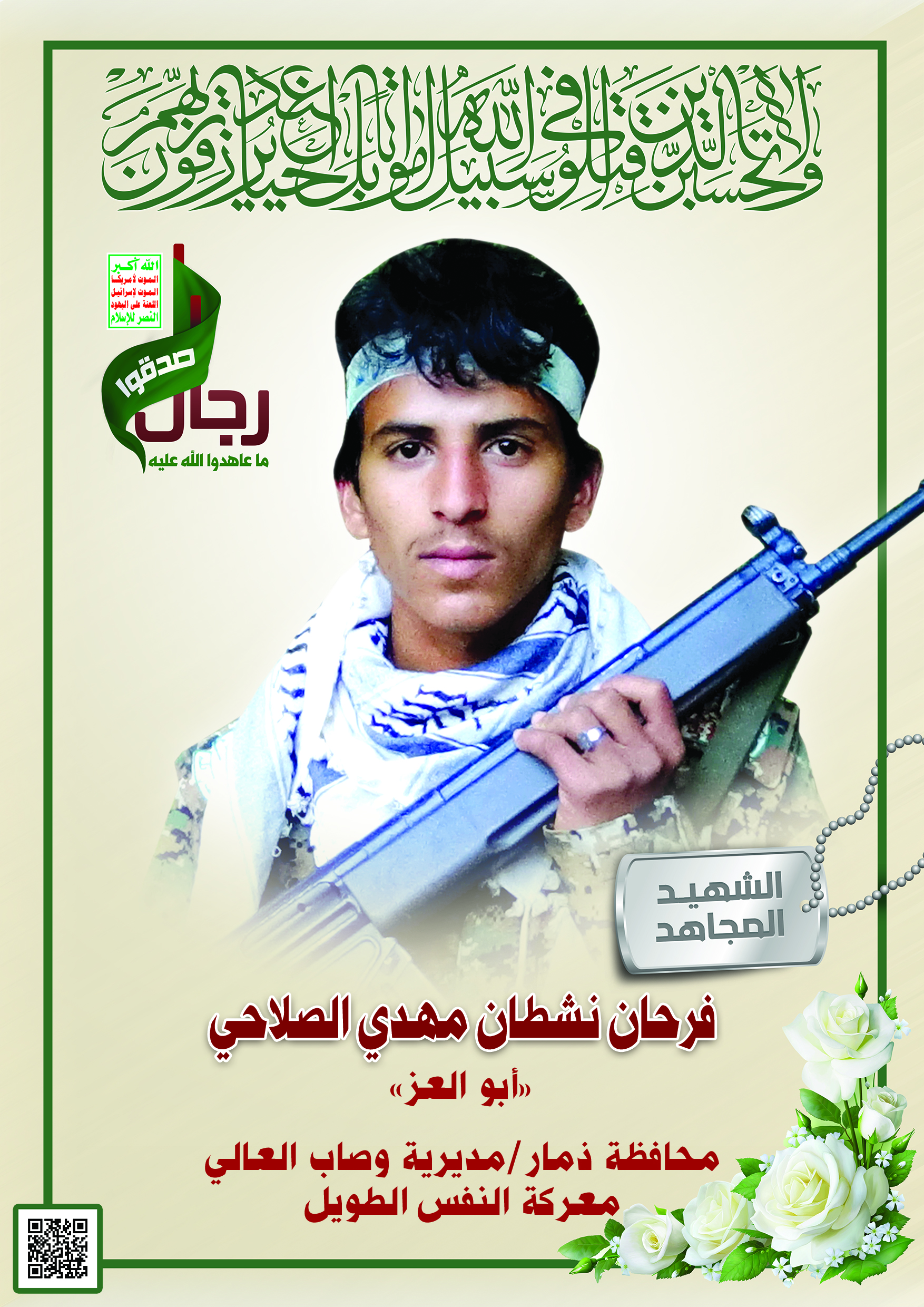Actor فرحان نشطان مهدي عبده الصلاحي Filmography الشهيد المجاهد: فرحان نشطان مهدي عبده الصلاحي – أبو العز المحافظة: ذمار المديرية: وصاب العالي – الجبجب معركة النفس الطويل رقم الحافظة: 140208 FILMOGRAPHY icon وصايا الخالدين الشهيد – فرحان نشطان مهدي عبده الصلاحي (ابو العز) 29/11/2023 29/11/2023