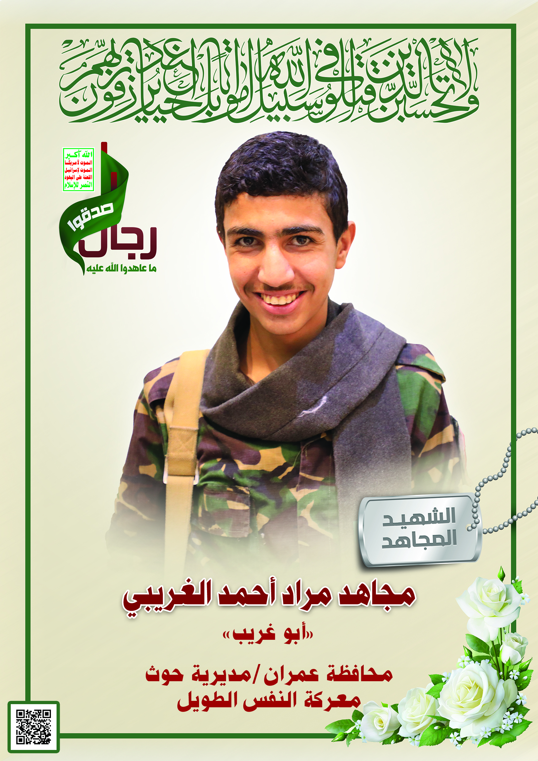 Actor مجاهد مراد أحمد فايد نايف الغريبي Filmography الشهيد المجاهد: مجاهد مراد أحمد فايد نايف الغريبي – أبو غريب المحافظة: عمران المديرية: حوث – بيت الغريبي معركة النفس الطويل رقم الحافظة: 140216