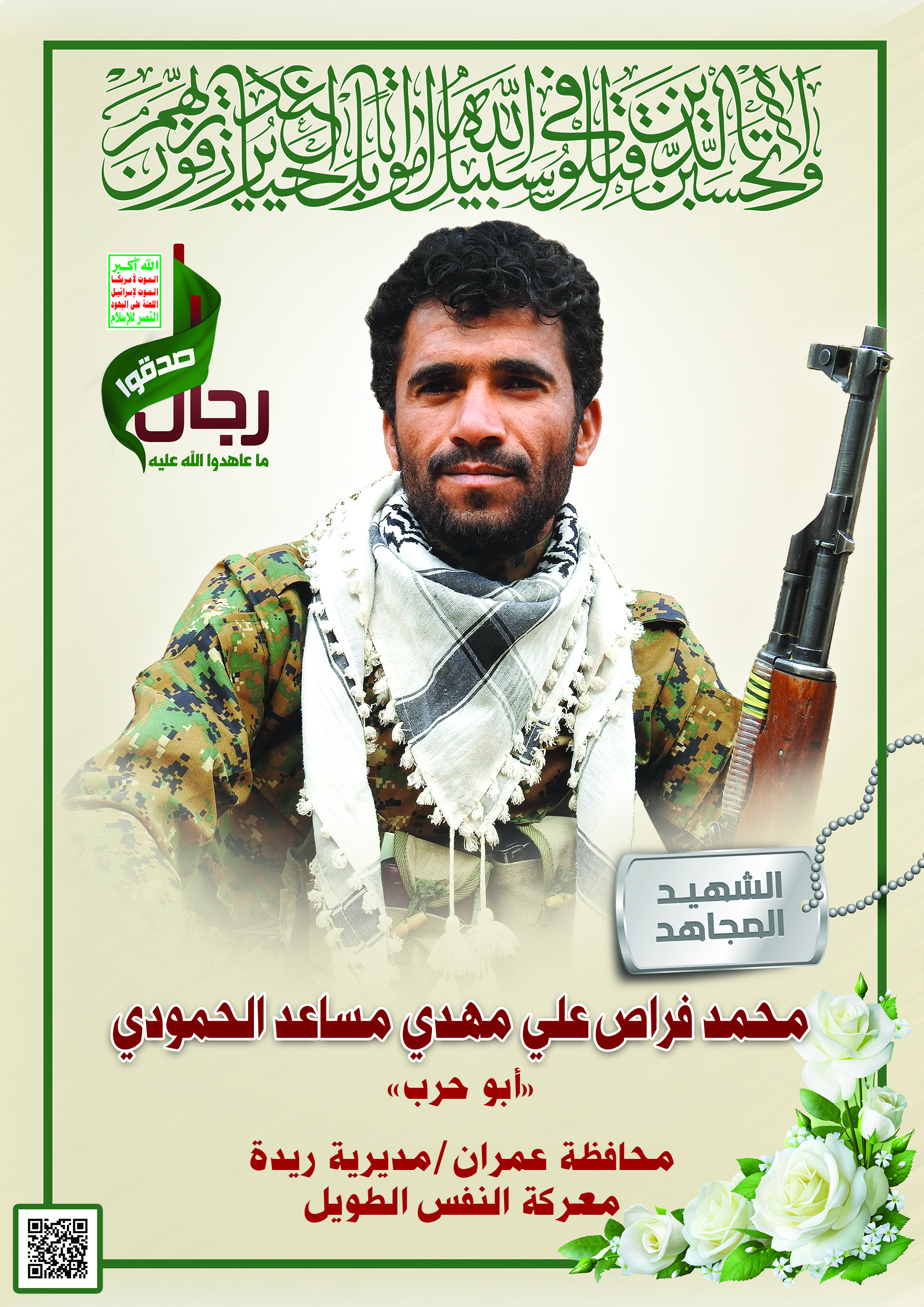 Actor محمد فراص علي مهدي مساعد الحمودي Filmography الشهيد المجاهد: محمد فراص علي مهدي م ساعد الحمودي – أبو حرب المحافظة: عمران المديرية: ريدة – معركة النفس الطويل رقم الحافظة: 140306