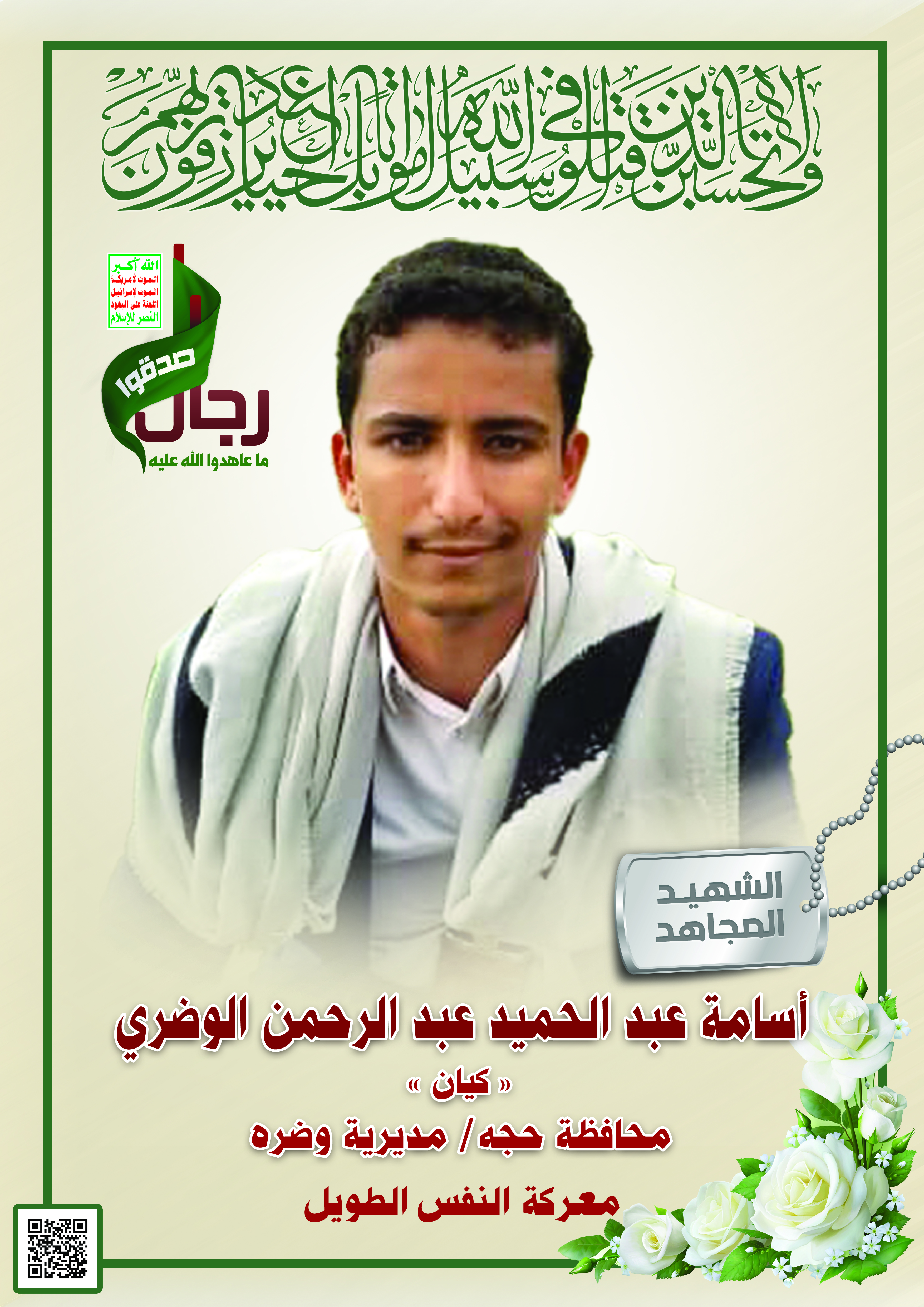 Actor أسامة عبدالحميد عبدالرحمن الوضري Filmography الشهيد المجاهد: أسامة عبدالحميد عبدالرحمن الوضري – أبو كيان المحافظة: حجة المديرية: وضرة معركة النفس الطويل رقم الحافظة: 140380